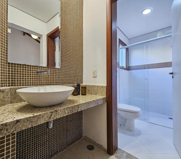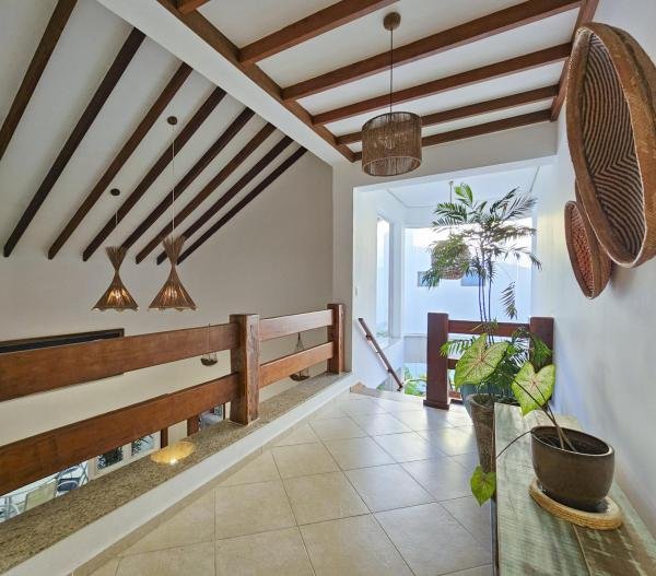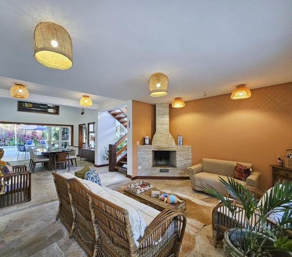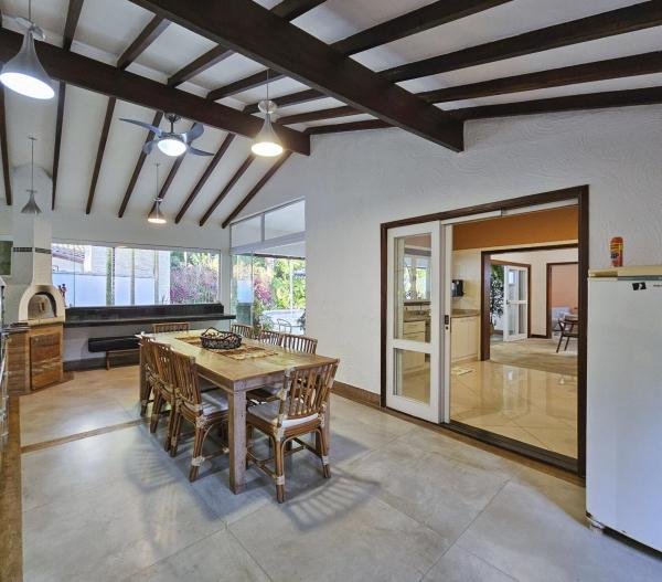 Belíssima casa assobradada, bem arejada, localizada em rua larga, contendo 4 suítes amplas, sendo uma no térreo, com ar-condicionado, living para 2 ambientes, lareira, sala de TV, lavabo, 4 vagas de garagem, cozinha americana, edícula, depósito, área de serviço, piscina com cascata, área gourmet com churrasqueira e forno a lenha. Sua área construída é de 339,20 m2 em um terreno grande de 576,67 m2.